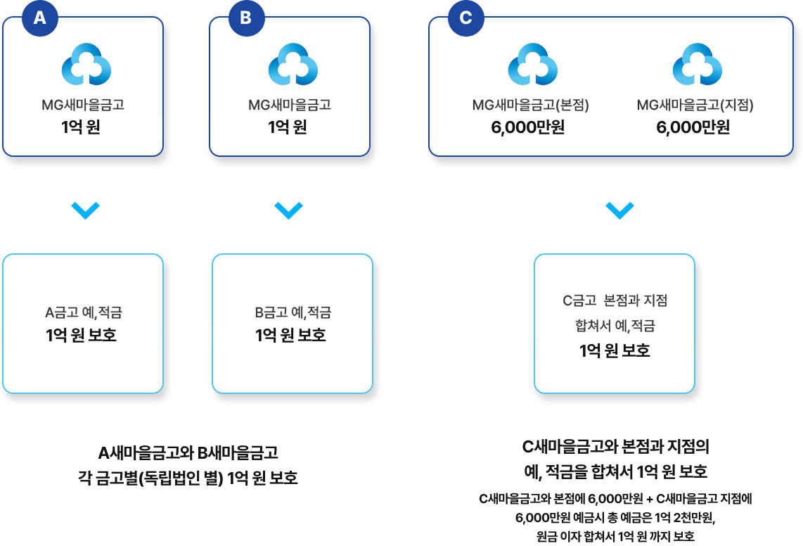 새마을금고가 고객의 예,적금을 지급하지 못하게 될 경우에는 각 새마을금고별로 은행과 동일하게 고객 1인당 1억원까지(원금과 소정의 이자)지급합니다.